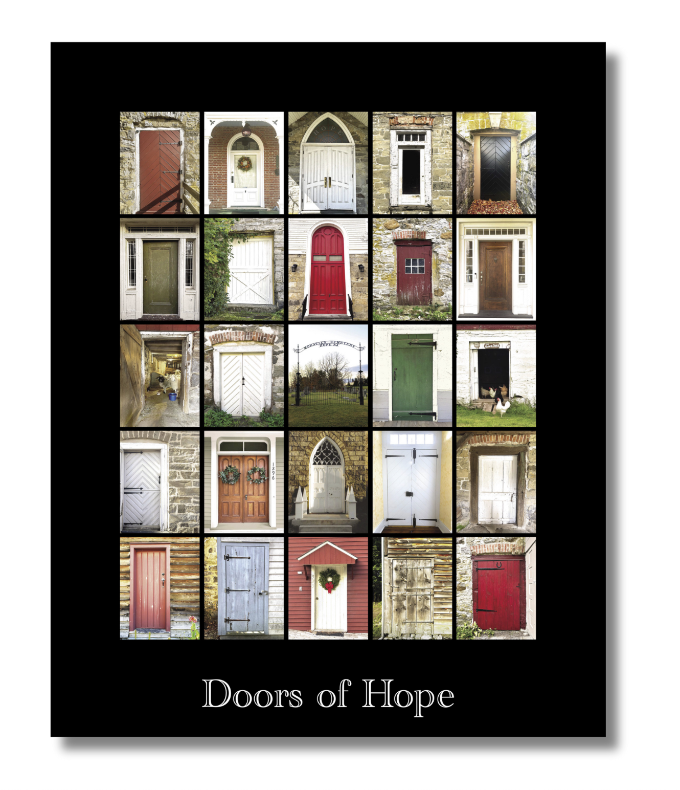 Poster featuring 25 doors in Hope, New Jersey, photographed and designed by Betsy Peterson as a fundraiser for H.O.P.E. (Help Our Preservation Effort).